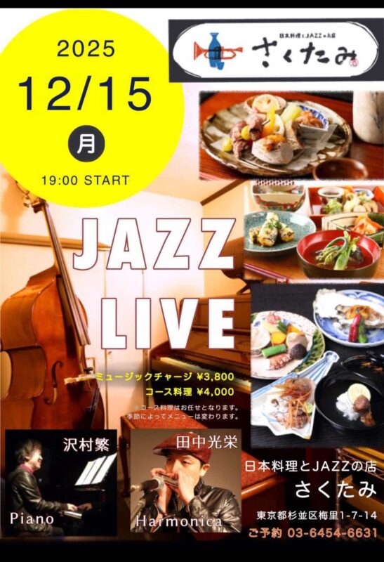 未分類 12月15日(月)沢村繁 田中光栄 JAZZ LIVE 12月15日(月)19:00 START ミュージックチャージ 3800円 コース料理 4000円 12月13日(土)近藤和彦 中島徹 12月17日(水)石井ひなた 長田信慶