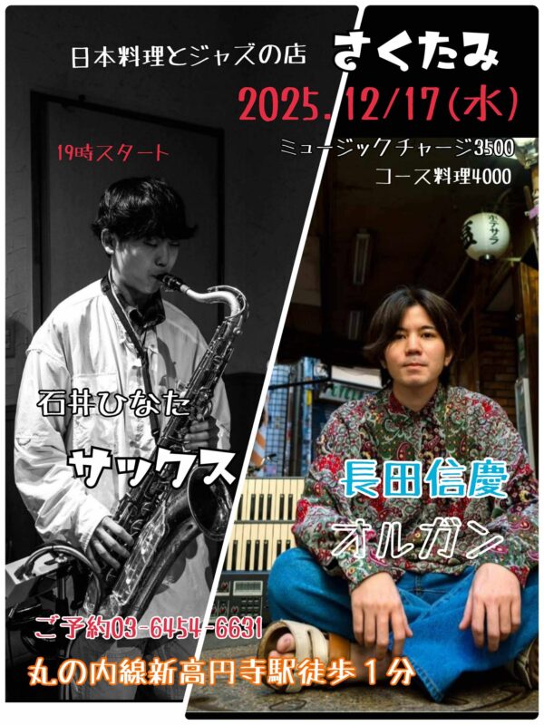 未分類 12月17日(水)石井ひなた 長田信慶 12月17日(水)19時スタート ミュージックチャージ 3500円 コース料理 4000円 12月15日(月)沢村繁 田中光栄 JAZZ LIVE 12月18日(木)板垣光弘 山下弘治