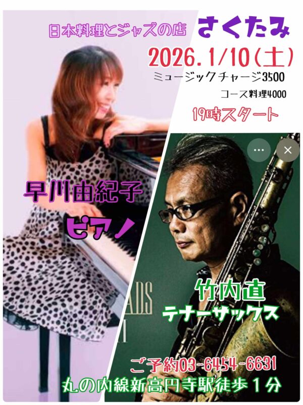 未分類 1月10日(土)早川由紀子 竹内直 1月10日(土)19時スタート ミュージックチャージ 3500円 コース料理 4000円 1月09日(金)吉永絢香 井上智 1月14日(水)守屋純子 鈴木直人