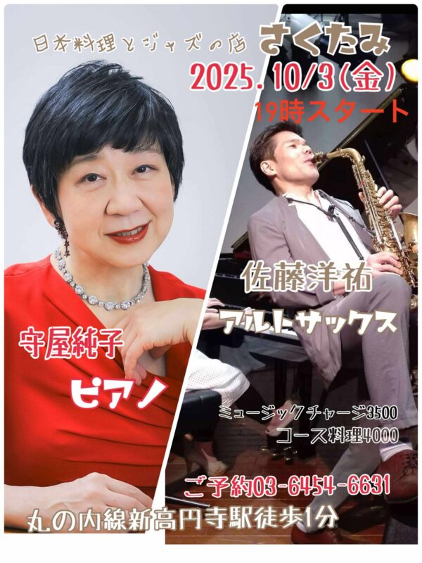 未分類 10月03日(金)守屋純子 佐藤洋祐 Posted on 2025年9月29日2025年9月29日 by 永澤文昭 10月3日(金)19時スタート ミュージックチャージ 3500円 コース料理 4000円 Continue reading →